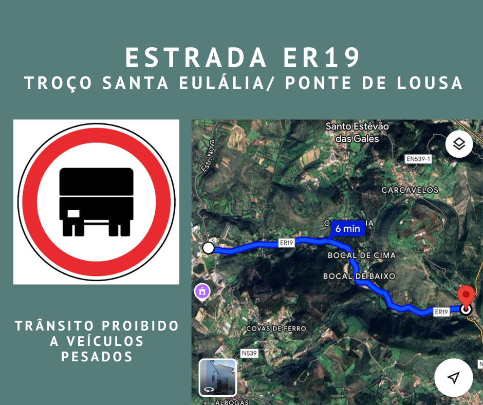 O Município de Mafra informa que, devido ao abatimento parcial da via, está interditada a circulação de veículos pesados no troço Santa Eulália/ Ponte de Lousa da ER19, de forma a salvaguardar a segurança de pessoas e bens.
