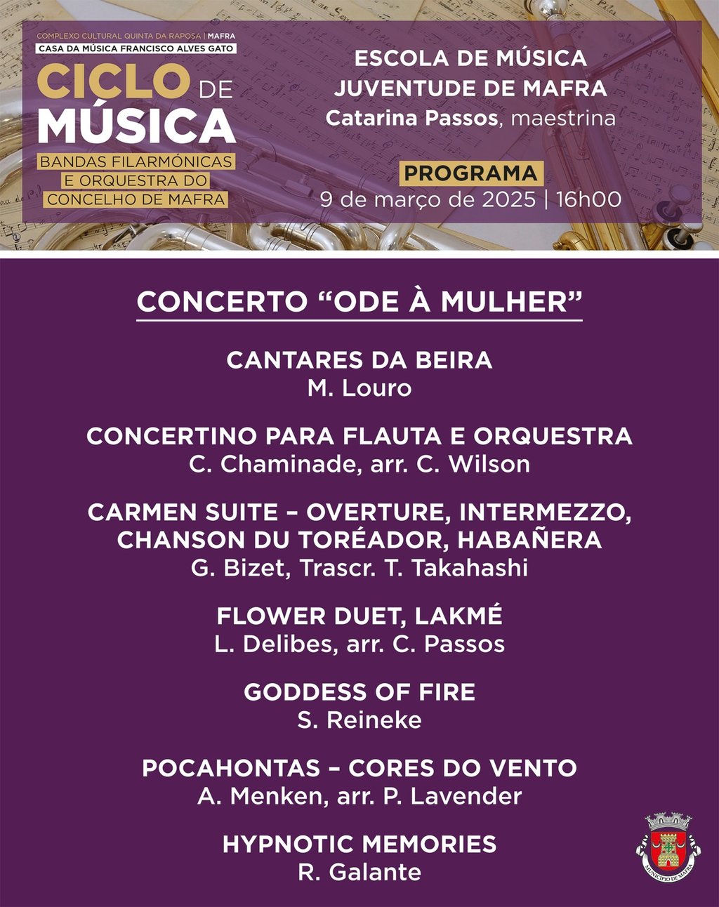 A Escola de Música Juventude de Mafra, sob a direção da maestrina Catarina Passos, é protagonista do próximo concerto do Ciclo de Música “Bandas Filarmónicas e Orquestra do Concelho de Mafra”. O espetáculo realiza-se no dia 9 de março, às 16h00, na Casa da Música Francisco Alves Gato, em Mafra.