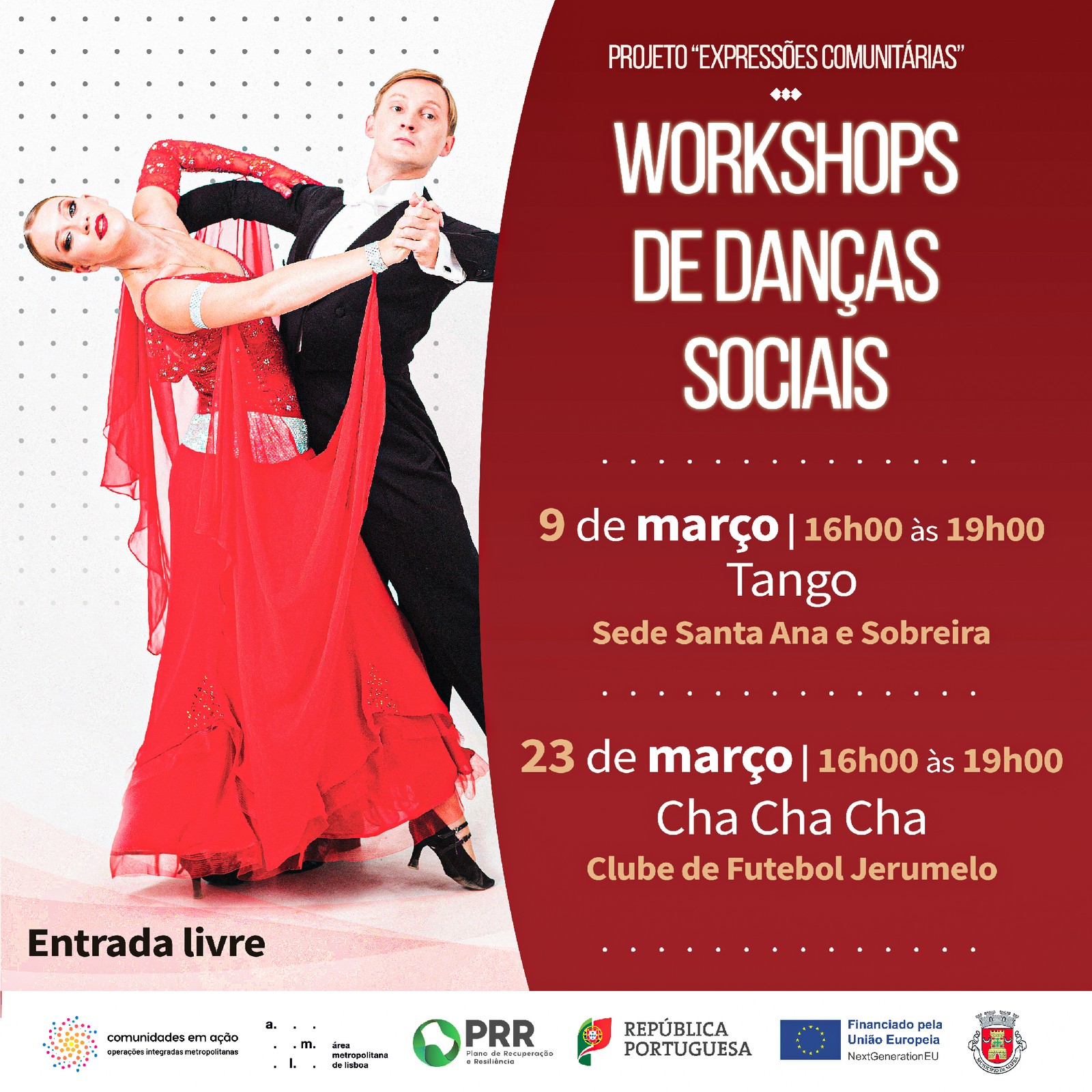 Gosta de dançar? No dia 9 de março, das 16h00 às 19h00, participe no workshop de danças sociais e descubra os principais passos de Tango, na Sede Santa Ana e Sobreira, na Freguesia do Milharado. A entrada é livre.
