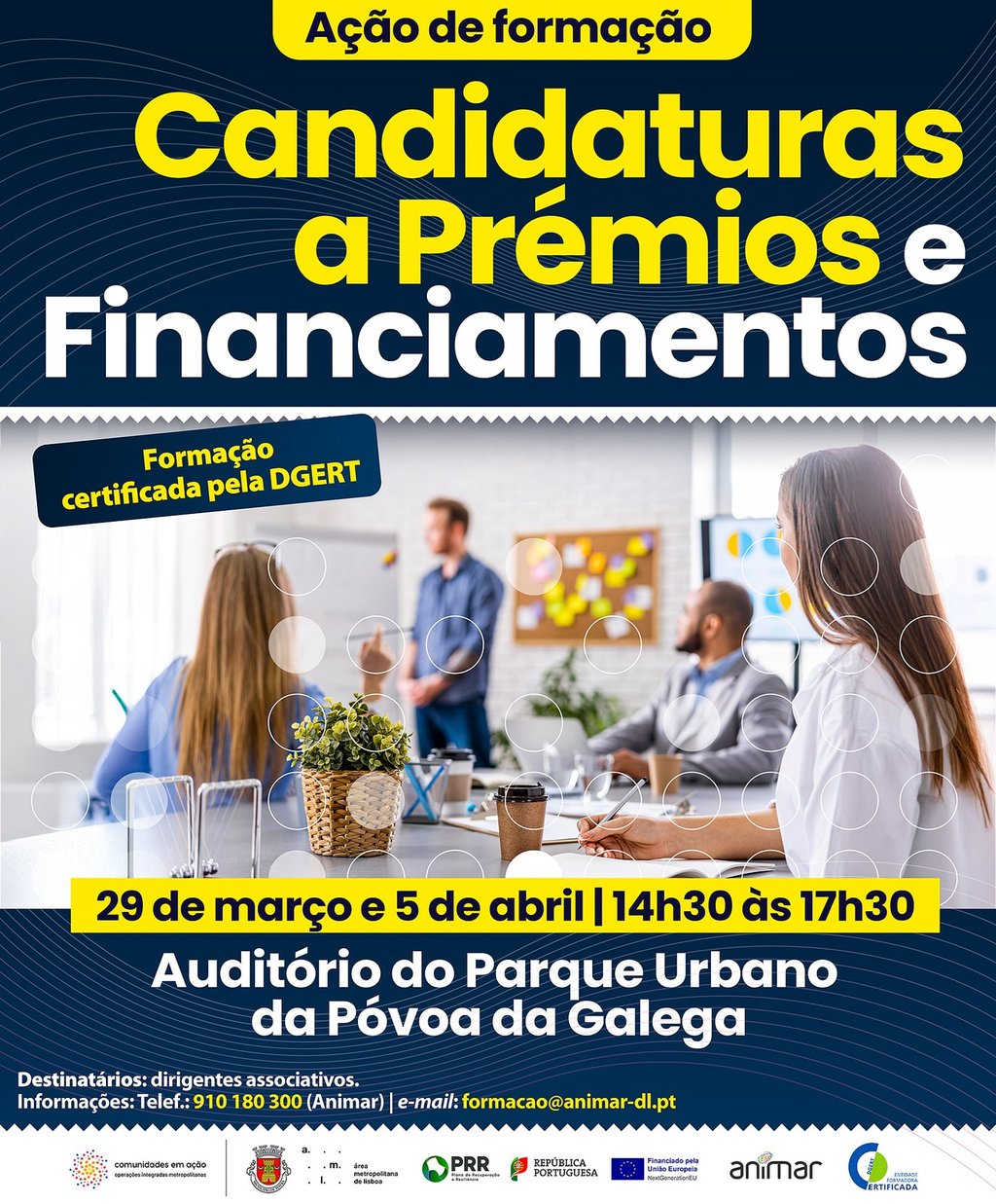 Capacitar os dirigentes associativos para a liderança. “Candidatura a Prémios e Financiamentos” é o tema da ação de formação, destinada a agentes e representantes das associações do Concelho de Mafra, que se realiza nos dias 29 de março e 5 de abril, das 14h30 às 17h30, no Auditório do Parque Urbano da Póvoa da Galega.