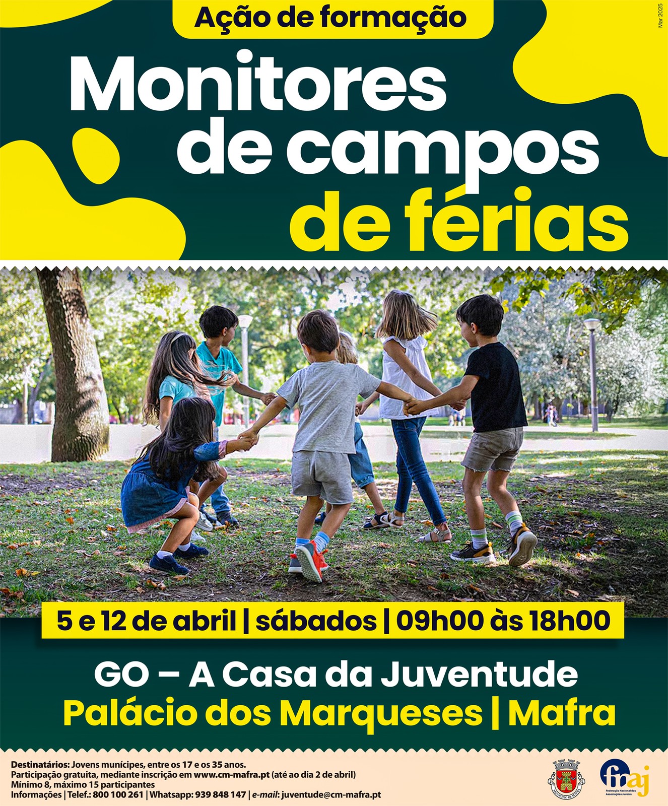 Gostavas de ser monitor de campos de férias? Se tens entre 17 e 35 anos, participa na ação de formação gratuita e descobre tudo sobre o planeamento de atividades, a gestão de um campo de férias e muito mais! A formação decorre nos dias 5 e 12 de abril, das 09h00 às 18h00, no GO – A Casa da Juventude (Palácio dos Marqueses, Mafra).