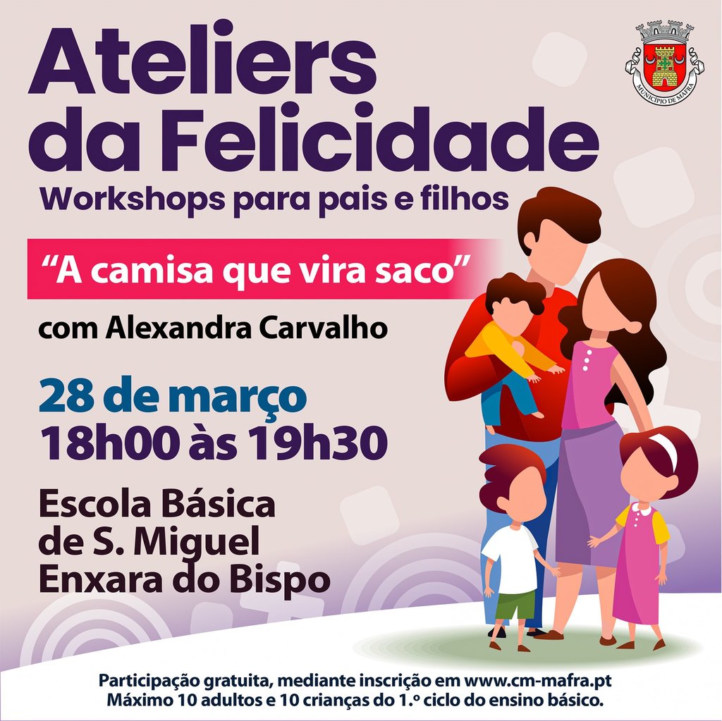 Estimular a criatividade e a motricidade dos mais pequenos, através de ateliers de manualidades, para crianças do 1.º ciclo e encarregados de educação. “A camisa que vira saco” é o tema do próximo “Atelier da Felicidade”, que se realiza no dia 28 de março, às 18h00, na Escola Básica de S. Miguel – Enxara do Bispo.