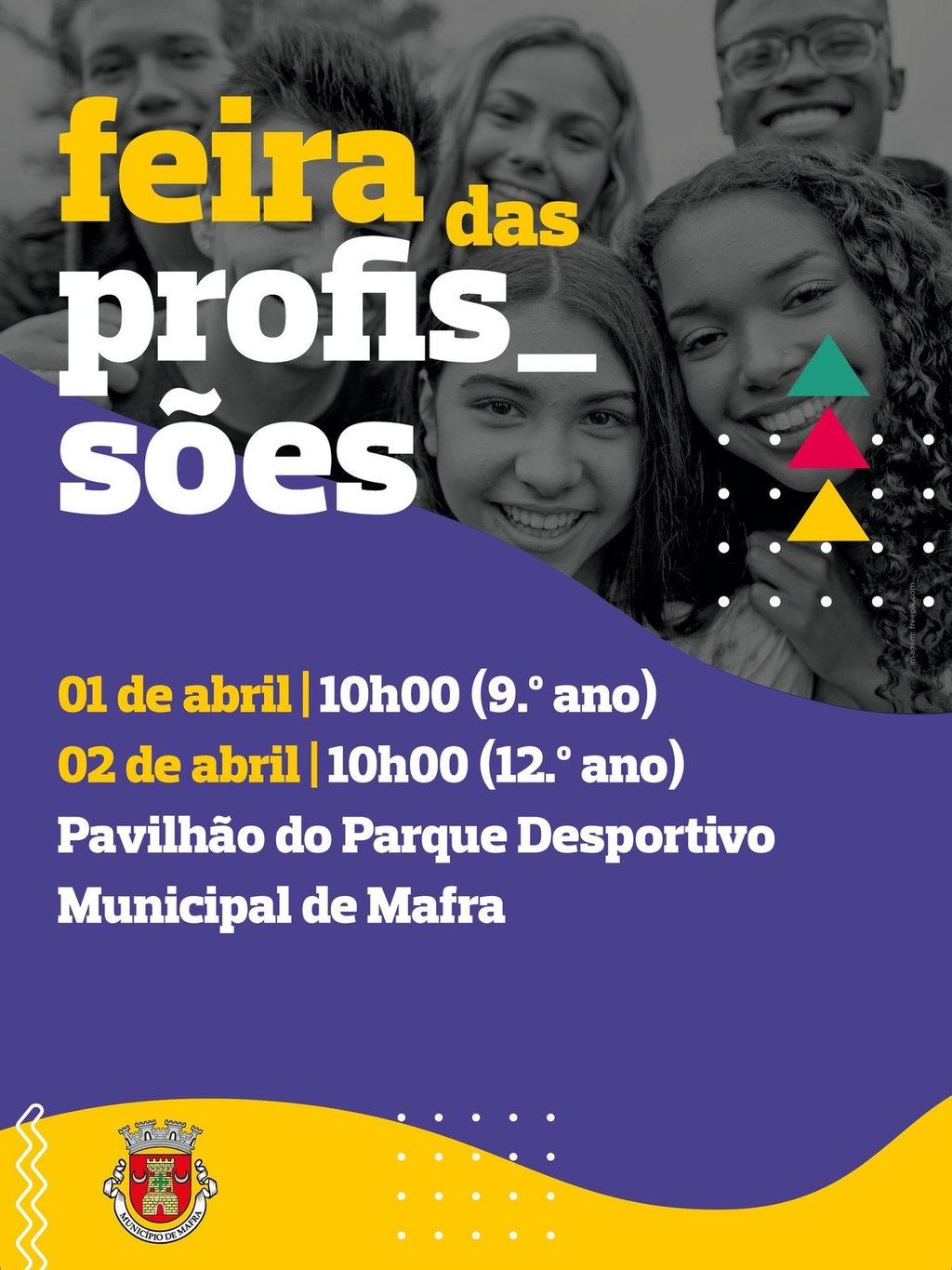 Queres explorar as tuas opções para o futuro? Gostavas de conhecer diferentes ofertas escolares e profissionais? Nos dias 1 e 2 de abril, a partir das 10h00, visita a Feira das Profissões, no Pavilhão do Parque Desportivo Municipal de Mafra, e decide sobre o teu futuro.