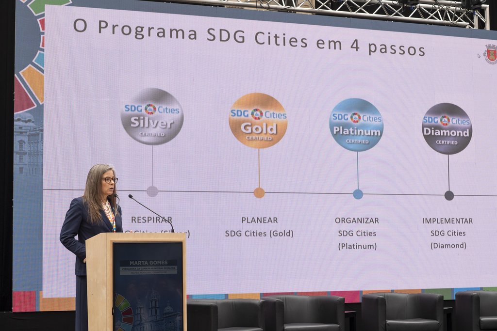 A experiência do Município de Mafra esteve em destaque, tendo a Vereadora da Câmara Municipal, Marta Gomes, apresentado as perspetivas e desafios após a criação do Relatório Voluntário Local (VLR). Seguiu-se a intervenção de Martino Miraglia, coordenador da equipa de localização dos ODS e Governos locais da UN-Habitat, e de Carolina Miranda, em representação do Ministério dos Negócios Estrangeiros. Nesta ocasião, o Município de Mafra foi distinguido com o certificado “Iniciativa Global Cidades ODS: Grau Ouro”, pelo progresso da autarquia em matéria de desenvolvimento sustentável.