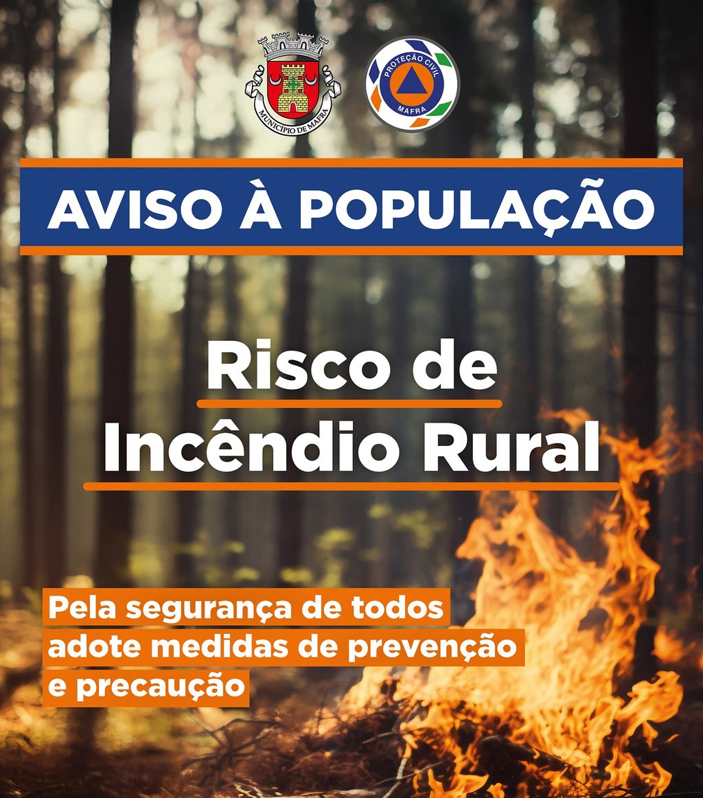 O Serviço Municipal de Proteção Civil informa que, de acordo com o Instituto Português do Mar e da Atmosfera (IPMA), foram emitidos avisos amarelo e laranja para temperaturas elevadas. Assim, e no que respeita ao perigo de incêndio rural, este vai estar, nos próximos dias e para o Concelho de Mafra, elevado e muito elevado, pelo que se aconselham medidas adicionais de precaução.