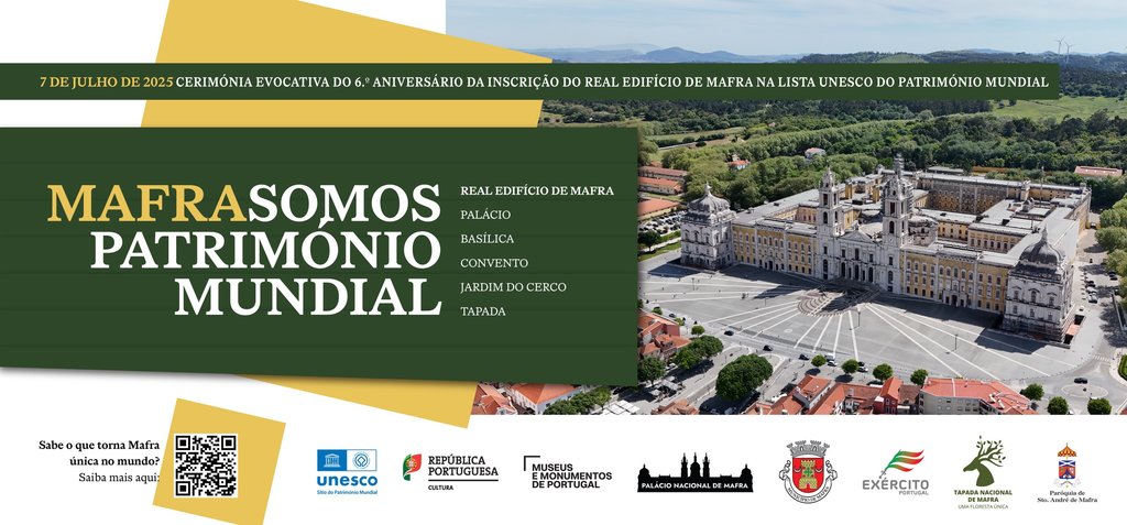 Somos Património Mundial! No dia 7 de julho de 2025 assinala-se o sexto aniversário da inscrição do Real Edifício de Mafra (Palácio, Basílica, Convento, Jardim do Cerco e Tapada) na Lista do Património Mundial da UNESCO. As entidades gestoras deste conjunto patrimonial organizam um diversificado programa de comemorações. Venha celebrar connosco!