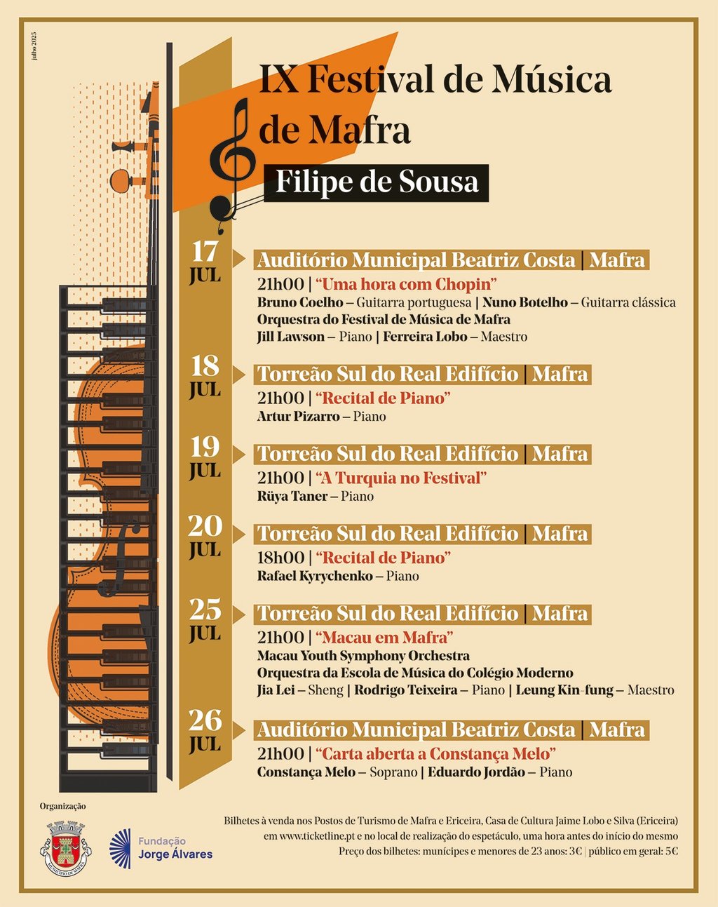 De 17 a 26 de julho, artistas de referência e outros talentos emergentes serão os protagonistas de seis concertos ao piano, de elevada qualidade. O Festival de Música de Mafra “Filipe de Sousa” está de regresso para a sua 9.ª edição, prestando nova homenagem ao ilustre mafrense, pianista, compositor e prestigiada figura da musicologia portuguesa que foi Filipe de Sousa. O programa de concertos divide-se entre o Torreão Sul do Real Edifício de Mafra e o Auditório Municipal Beatriz Costa, em Mafra.