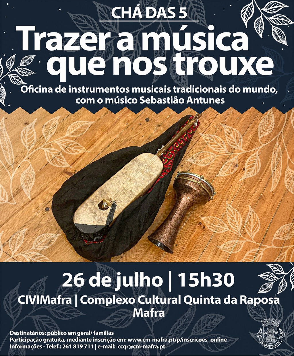 No próximo sábado, 26 de julho, a iniciativa “O Chá das Cinco” tem uma sessão temática especial, dedicada aos instrumentos musicais do mundo, com a presença do músico Sebastião Antunes. “Trazer a Música que nos Trouxe” promete dar a conhecer os ritmos e sons tradicionais de diferentes tribos e culturas. Não perca a sessão, às 15h30, no CIVIMafra (Complexo Cultural Quinta da Raposa).