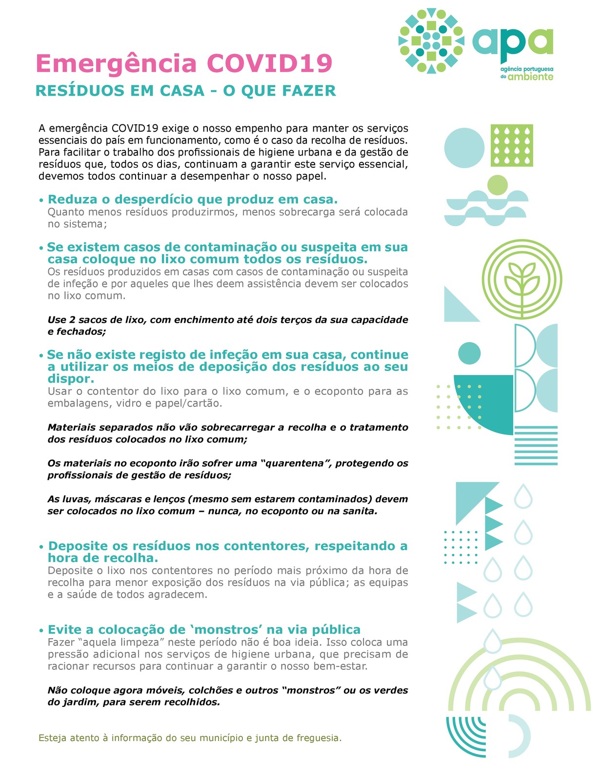 Siga as orientações da Agência Portuguesa do Ambiente. A emergência COVID19 exige o nosso empenho para manter os serviços essenciais do país em funcionamento, como é o caso da recolha de resíduos. Para facilitar o trabalho dos profissionais de higiene urbana e da gestão de resíduos que, todos os dias, continuam a garantir este serviço essencial, devemos todos continuar a desempenhar o nosso papel.