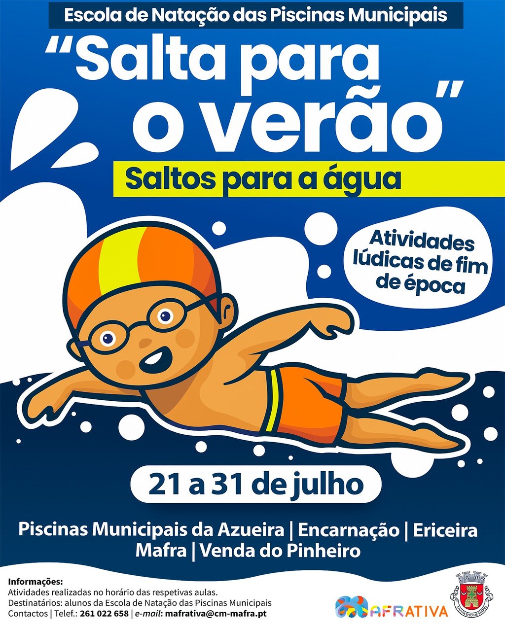 De 21 a 31 de julho, participa no programa de atividades lúdicas de fim de época, nas Piscinas Municipais da Azueira, Encarnação, Ericeira, Mafra e Venda do Pinheiro. “Salta para o verão” inclui a realização jogos e exercícios práticos, com saltos para a água, durante o horário das aulas da Escola de Natação.
