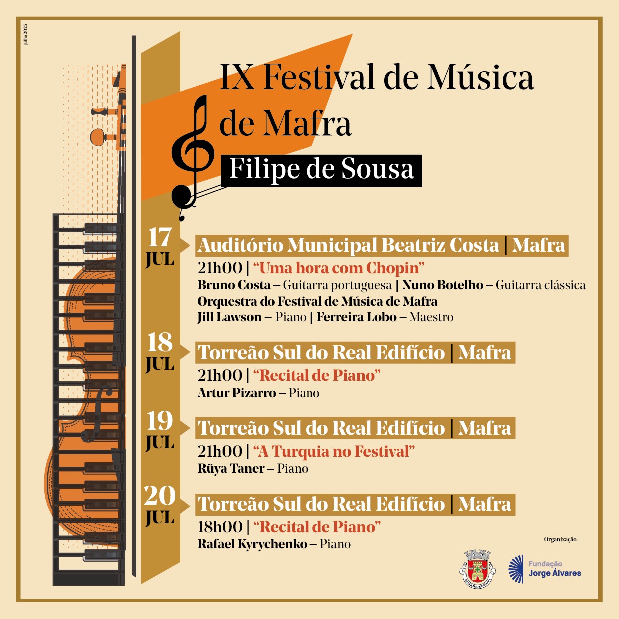 Não perca, no dia 17 de julho, às 21h00, o espetáculo de abertura, dedicado às composições de Chopin, no Auditório Municipal Beatriz Costa. O concerto é protagonizado pelos guitarristas Bruno Costa e Nuno Botelho e pela pianista Jill Lawson, acompanhados da Orquestra do Festival de Música de Mafra, com direção do maestro Ferreira Lobo.