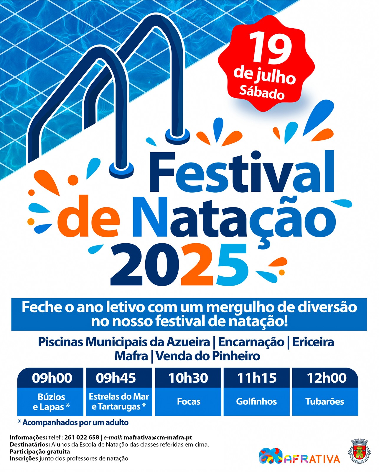 Para assinalar o final da época desportiva 2024/2025, a Câmara Municipal dinamiza o Festival de Natação, com um programa especial de atividades para alunos das várias classes da Escola de Natação das Piscinas Municipais. No sábado, dia 19 de julho, a partir das 09h00, feche o ano letivo com um mergulho de diversão!