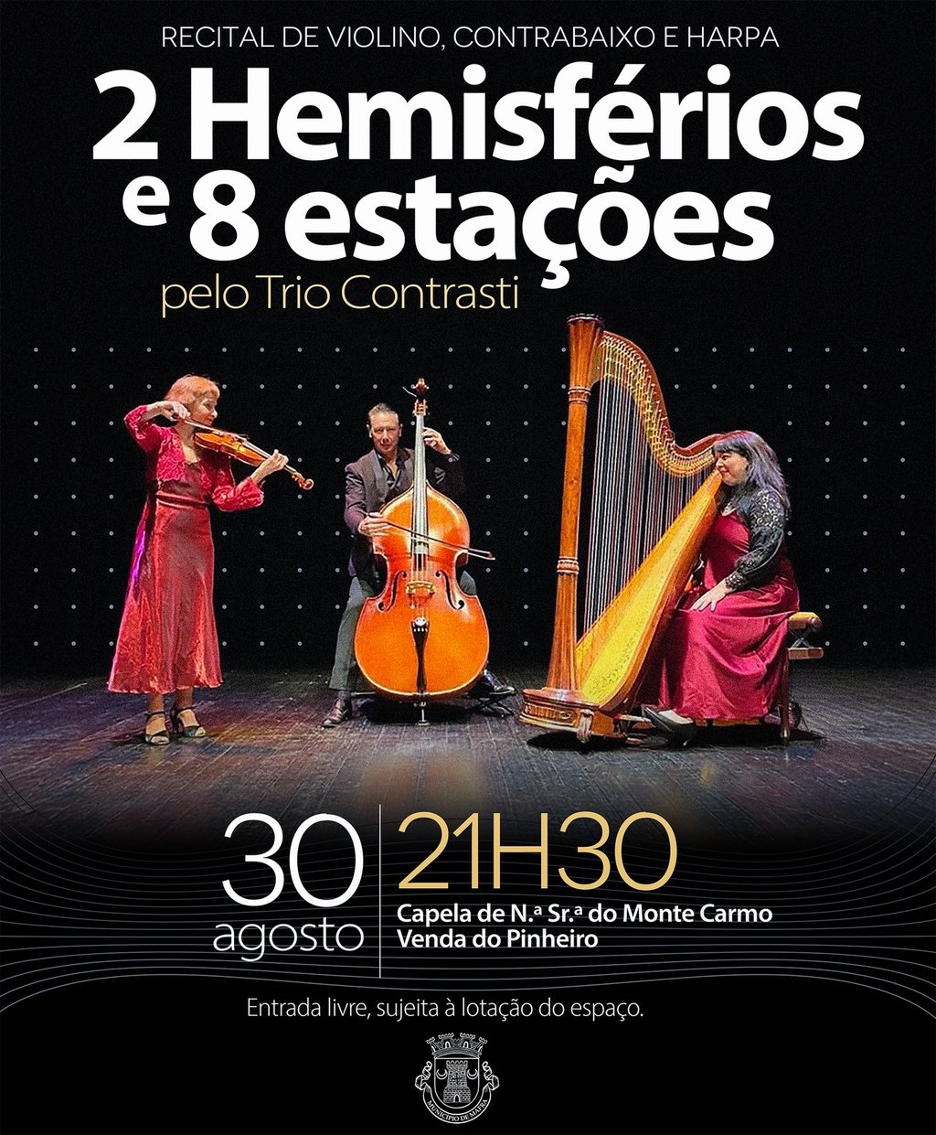 "2 Hemisférios & 8 estações" é o tema do recital de violino, contrabaixo e harpa, interpretado pelo Trio Contrasti, que decorrerá na Capela de N.ª Sr.ª do Monte Carmo (Venda do Pinheiro). Assista ao concerto, no dia 30 de agosto, às 21h30.