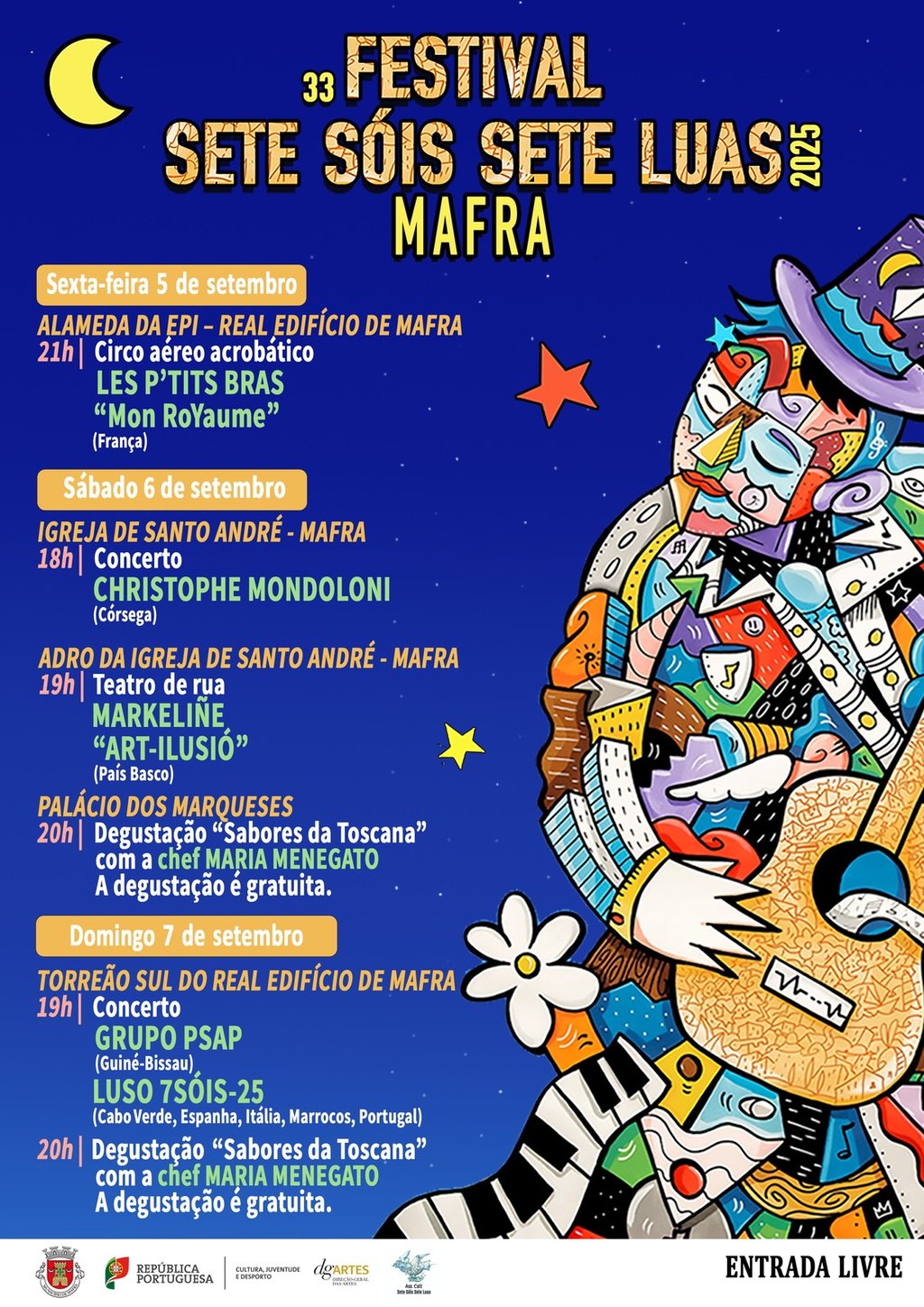 Artes circenses, música popular contemporânea, teatro de rua e sessões de degustação. De 5 a 7 de setembro, o Festival Sete Sóis Sete Luas regressa à vila de Mafra com um programa de espetáculos, protagonizados por artistas nacionais e internacionais.