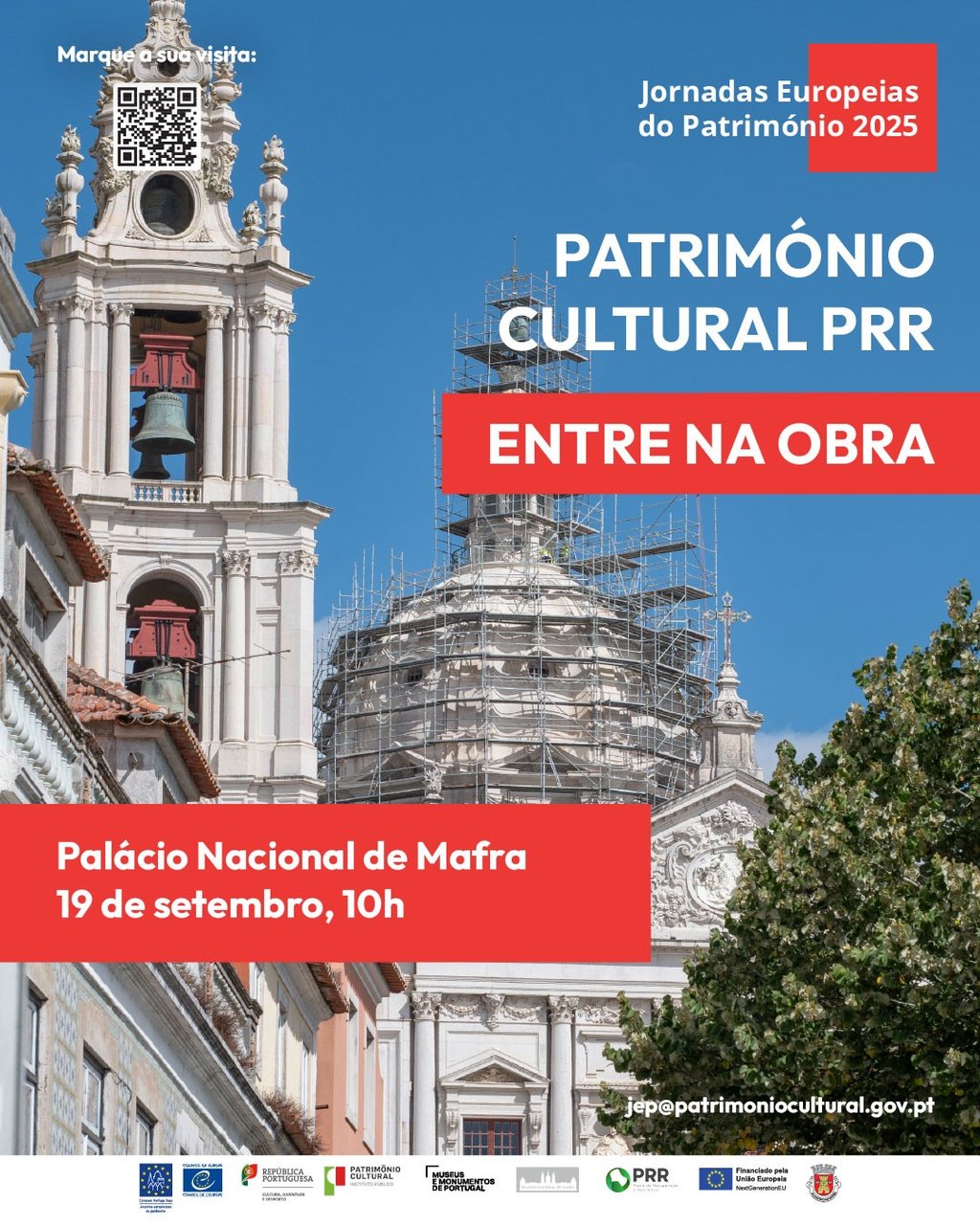 No âmbito do programa “Património Cultural PRR: Entre na Obra”, o Município de Mafra informa que, entre os dias 17 e 20 de setembro, o Património Cultural, I.P. dinamiza visitas guiadas a 18 monumentos nacionais, que estão a ser alvo de requalificação, no âmbito do Programa de Recuperação e Resiliência na área da Cultura (PRR Cultura). A visita ao Palácio Nacional de Mafra está marcada para o dia 19 de setembro, às 10h00.