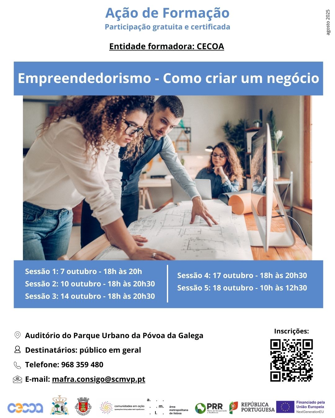 O que é o empreendedorismo? Como se gere um negócio? Que ferramentas e recursos são necessários para enfrentar o mercado? São estas e outras questões que irão ser respondidas na formação gratuita e certificada “Empreendedorismo - Como criar um negócio”, que decorre entre os dias 7, 10, 14, 17 e 18 de outubro, no Auditório do Parque Urbano da Póvoa da Galega.