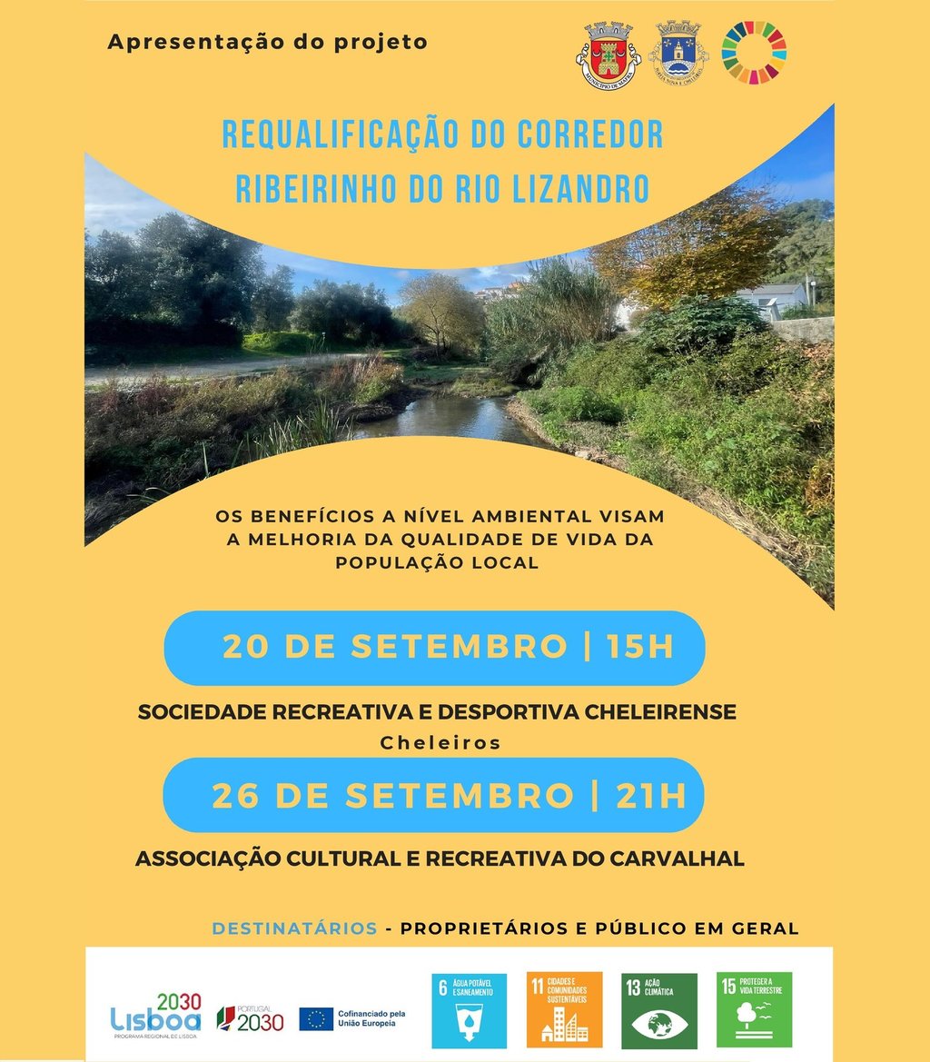 No âmbito do projeto “Requalificação do Corredor Ribeirinho do Rio Lizandro”, aprovado pelo Programa Regional Lisboa 2030 (FEDER), o Município de Mafra e a União das Freguesias de Igreja Nova e Cheleiros dinamizam duas sessões públicas de sensibilização e esclarecimento. As sessões realizam-se no dia 20 de setembro (15h00, na Sociedade Recreativa e Desportiva Cheleirense) e no dia 26 de setembro (21h00, Associação Cultural e Recreativa de Carvalhal).