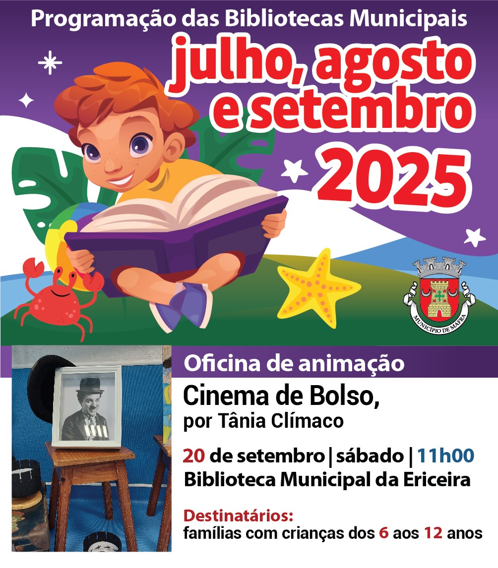 Ainda não tem planos para o próximo sábado (20 de setembro), com as suas crianças? Participe na oficina “Cinema de Bolso”, dinamizada por Tânia Clímaco, para famílias com crianças dos 6 aos 12 anos, e venha descobrir os segredos do cinema de animação. A atividade realiza-se às 11h00, na Biblioteca Municipal da Ericeira.