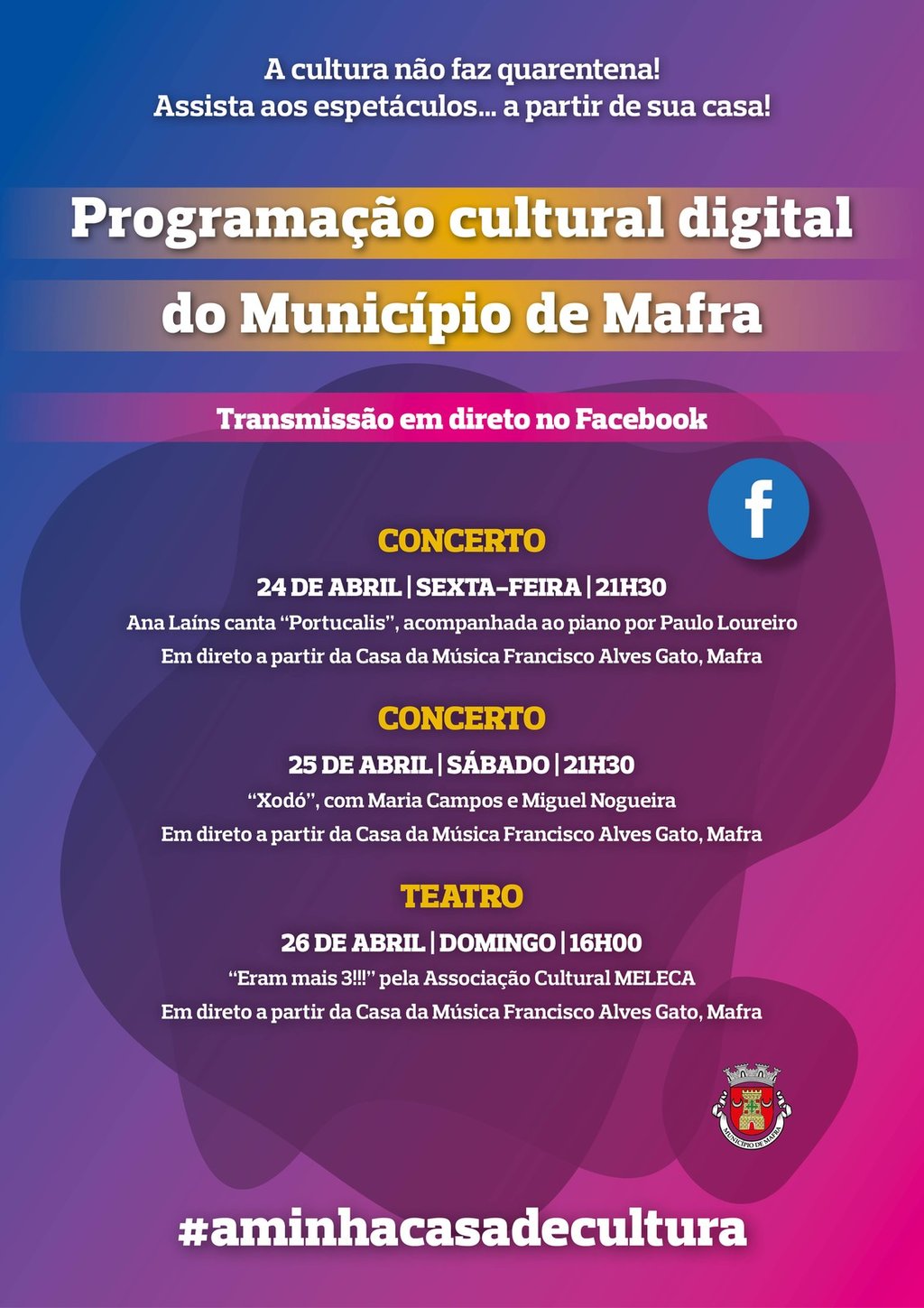 Está de regresso a programação cultural digital do Município de Mafra. Nesta sexta, sábado e domingo, a Câmara Municipal continua a levar a cultura às nossas casas, transmitindo em direto, através do Facebook, espetáculos de música e teatro.