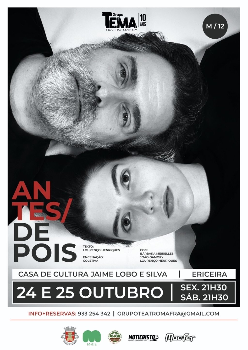 Dez anos depois de subir ao palco pela primeira vez, o Grupo TEMA – Teatro Mafra volta a levar a cena a produção “Antes/Depois”, uma reflexão sobre o amor, um mergulho na construção das relações, no seu desenvolvimento, no seu fim. A estreia está marcada para os dias 24 e 25 de outubro, às 21h30, na Casa de Cultura Jaime Lobo e Silva, na Ericeira.