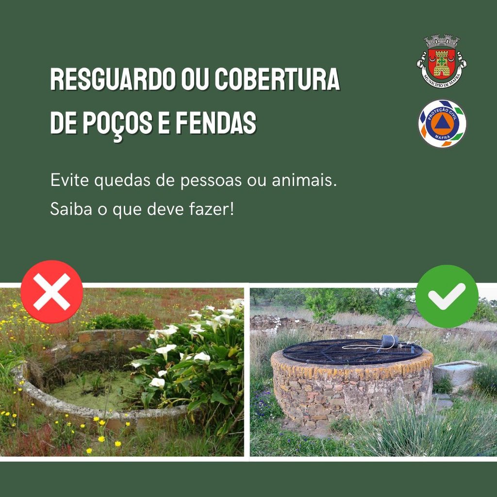 O Serviço Municipal de Proteção Civil de Mafra informa que é obrigatório o resguardo ou a cobertura eficaz de poços, fendas ou irregularidades existentes em quaisquer terrenos, que possam causar quedas a pessoas ou animais.