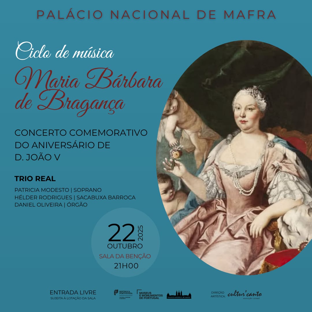 No dia 22 de outubro, há “Música no Palácio”! Celebrando o aniversário do Rei D. João V (nascido em 1689), o concerto propõe uma viagem musical, com peças dos compositores Carlos Seixas, Haendel ou Vivaldi, com início às 21h00, na Sala da Bênção do Palácio Nacional de Mafra.