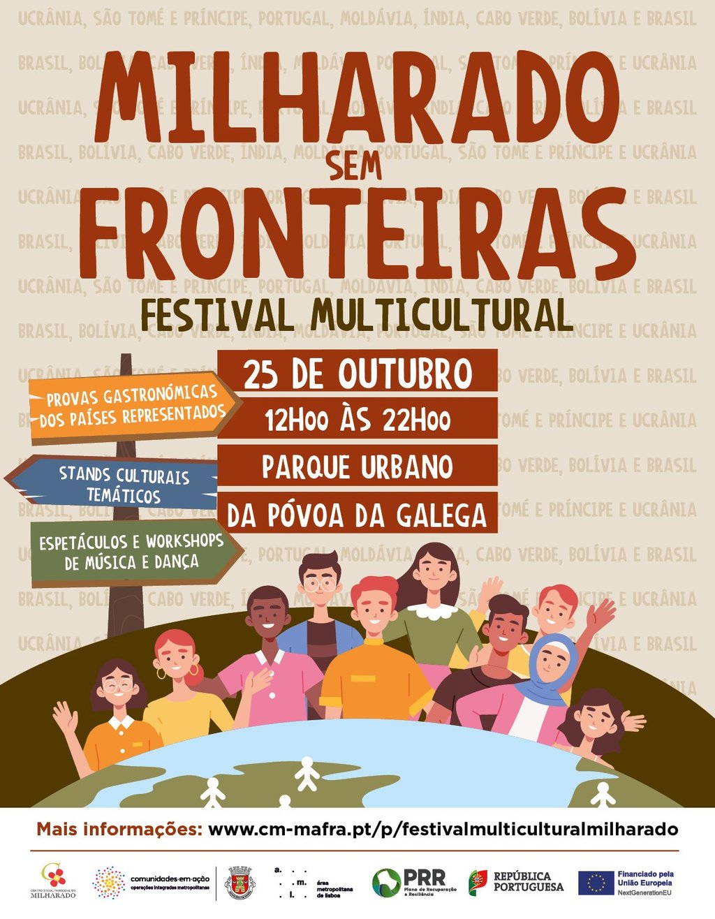 No próximo sábado, 25 de outubro, o Parque Urbano da Póvoa da Galega é palco do Festival Multicultural “Milharado Sem Fronteiras”, um encontro de diferentes nacionalidades, com apresentação dos costumes e tradições da comunidade estrangeira à comunidade local. Das 12h00 às 22h00, venha viver uma experiência única de partilha e união entre povos e culturas.
