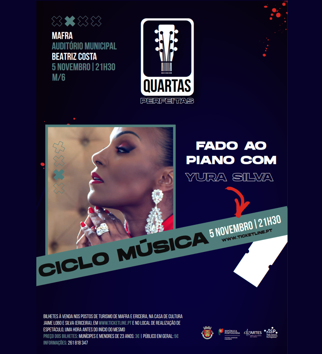 Uma noite de Fado ao piano. Yura Silva, soprano nos Shout! – o primeiro grupo Gospel nacional – e coralista de reconhecidos nomes da música portuguesa, sobe ao palco do Auditório Municipal Beatriz Costa (Mafra), para mais uma “Quarta Perfeita”. Não perca o concerto, no dia 5 de novembro, às 21h30.