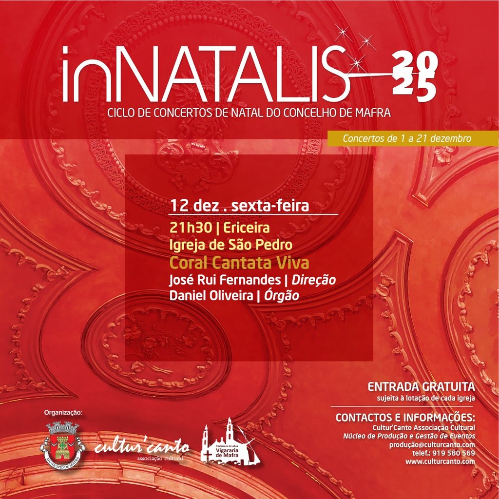 Ericeira. Esta noite (sexta-feira, 12 de dezembro), às 21h30, assista a mais um concerto In’Natalis, na Igreja de São Pedro. As mais conhecidas músicas de Natal vão ser interpretadas pelo organista Daniel Oliveira, acompanhado do Coral Cantata Viva, sob a direção de José Rui Fernandes.