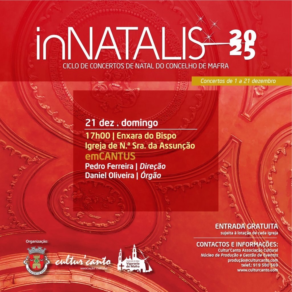 Enxara do Bispo. Hoje (domingo, 21 de dezembro), às 17h00, a Igreja de N.ª Sra. da Assunção recebe o último concerto In’Natalis, com as melhores canções da quadra natalícia. O concerto é protagonizado pelo organista Daniel Oliveira, acompanhado do grupo emCANTUS, sob a direção de Pedro Ferreira.