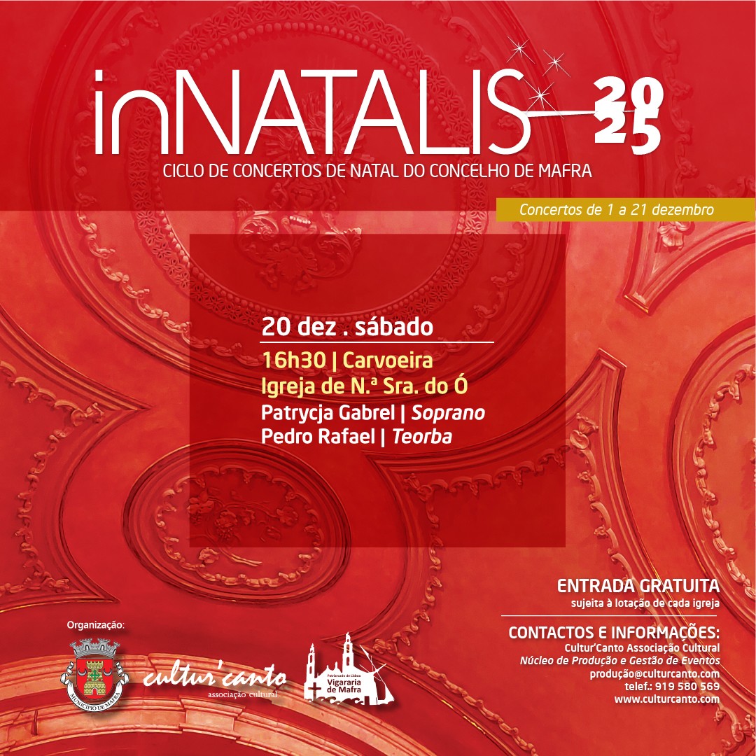 Carvoeira e Venda do Pinheiro. Hoje (sábado, 20 de dezembro), às 16h30, assista a mais um concerto In’Natalis, na Igreja de N.ª Sra. do Ó, na Carvoeira. As mais conhecidas músicas de Natal vão ser interpretadas pela soprano Patrycja Gabrel, acompanhada do músico Pedro Rafael (teorba).