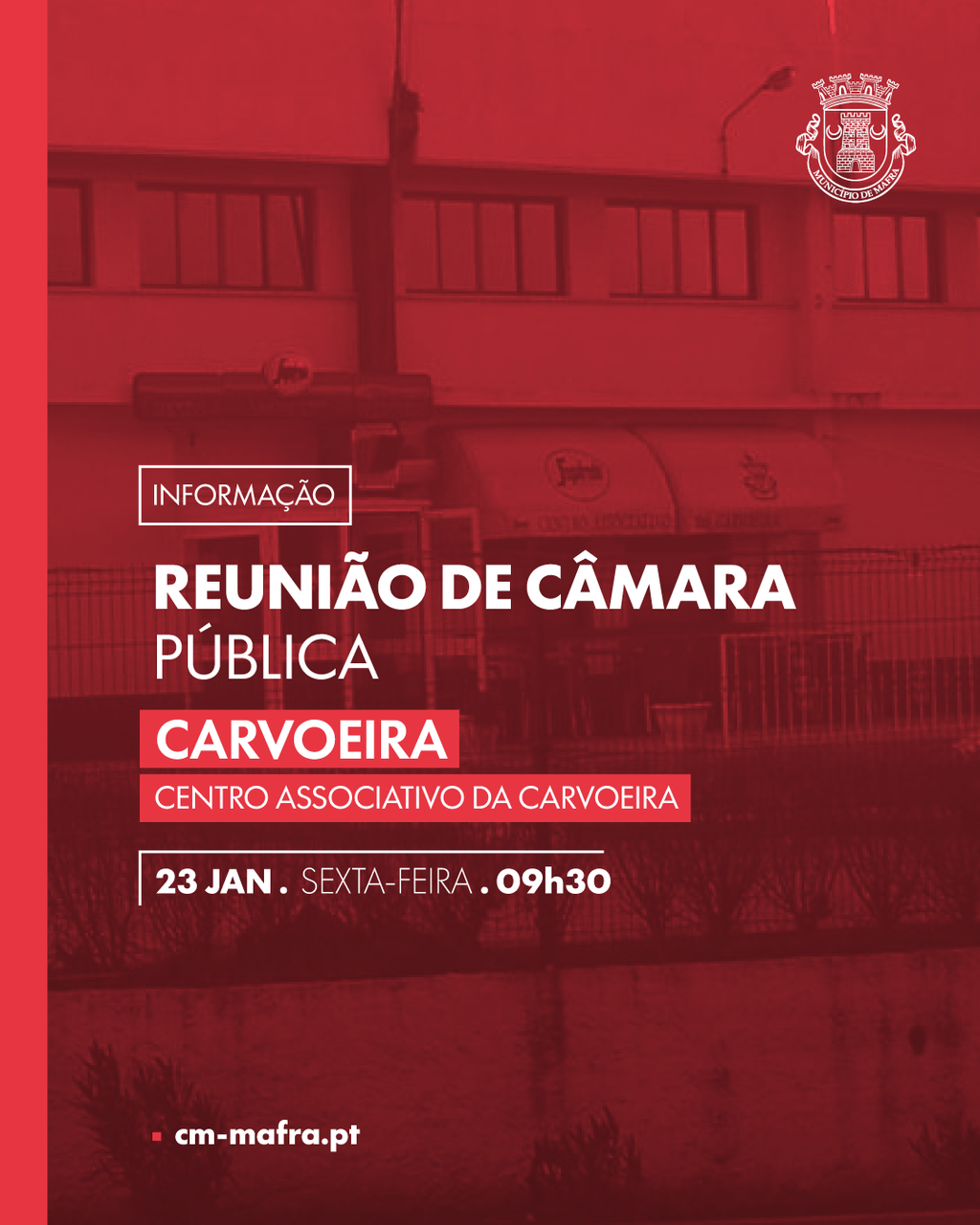 Para uma maior proximidade, transparência e participação dos cidadãos, as reuniões ordinárias públicas da Câmara Municipal de Mafra passam a ser descentralizadas. No dia 23 de janeiro, sexta-feira, a sessão terá lugar no Centro Associativo da Carvoeira (Estrada Adega Cruz, Carvoeira), às 09h30.