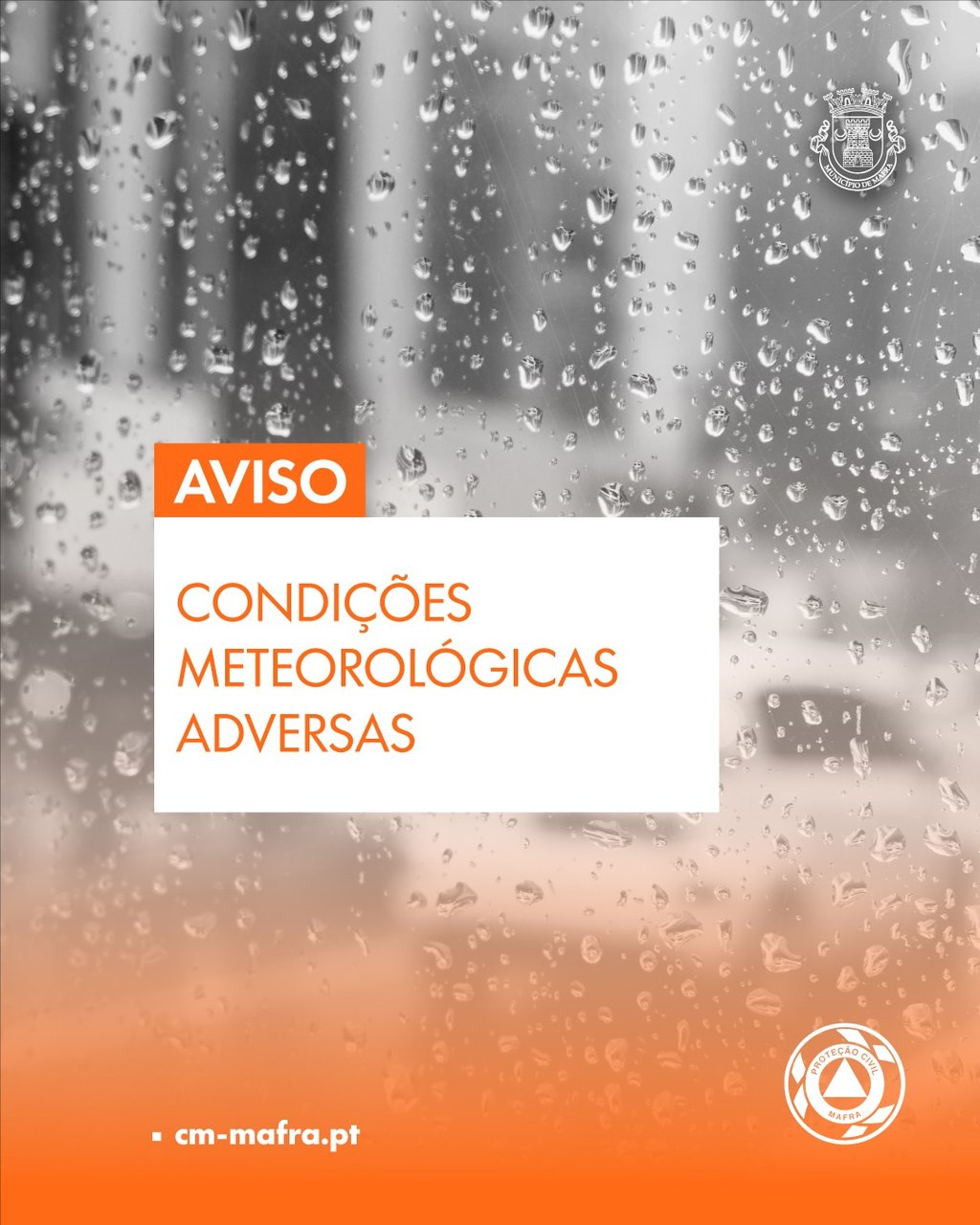 O Serviço Municipal de Proteção Civil informa que, de acordo com o Instituto Português do Mar e da Atmosfera, está previsto um agravamento das condições meteorológicas, nas próximas 48h. Recomenda-se a adoção de uma atitude preventiva na circulação pedonal e rodoviária.