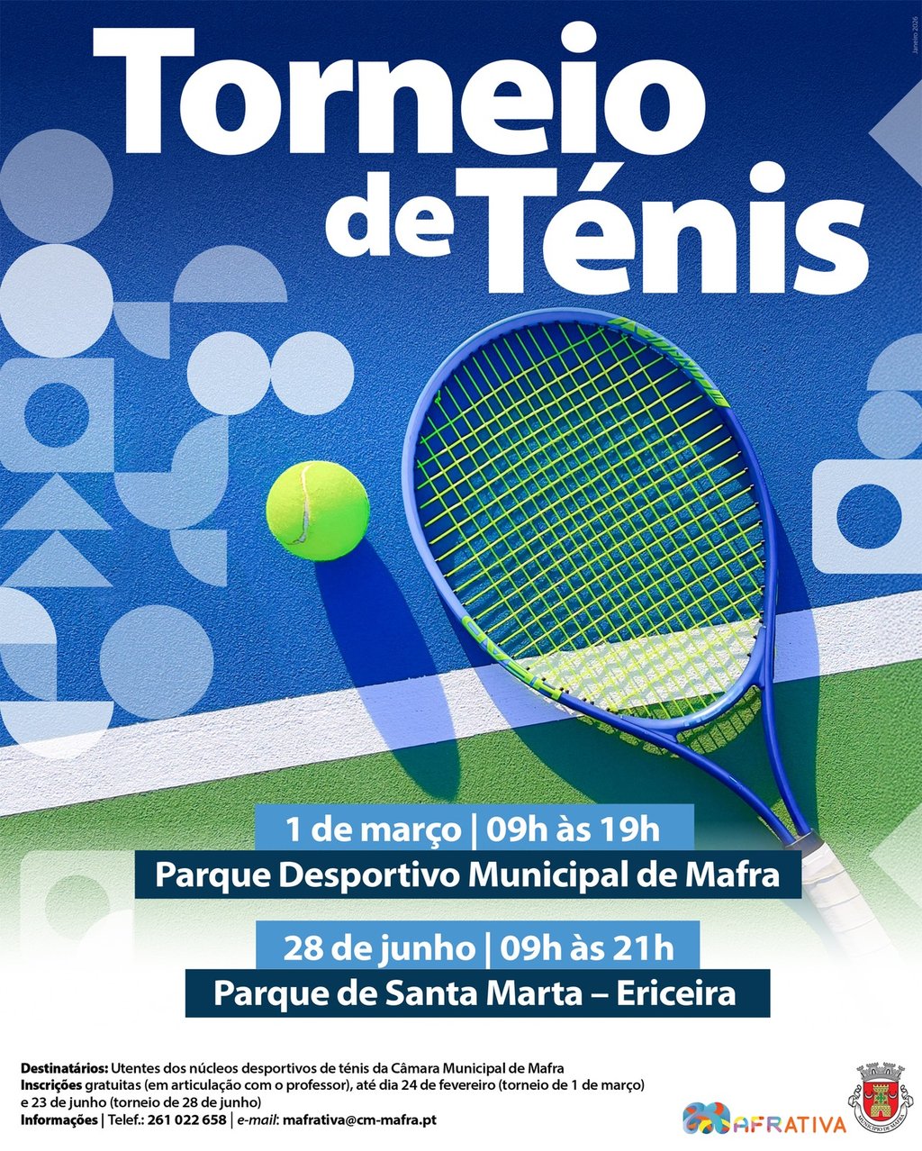 Praticas ténis nos núcleos desportivos municipais? Gostavas de participar num torneio com outros atletas? No dia 1 de março, a partir das 09h00, participa nesta competição e mostra o teu talento nos campos de ténis do Parque Desportivo Municipal de Mafra.