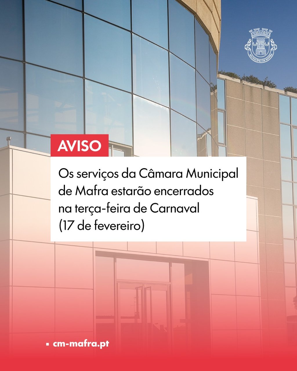 Informa-se que os serviços da Câmara Municipal de Mafra se encontram encerrados na terça-feira de Carnaval, dia 17 de fevereiro do corrente ano.
