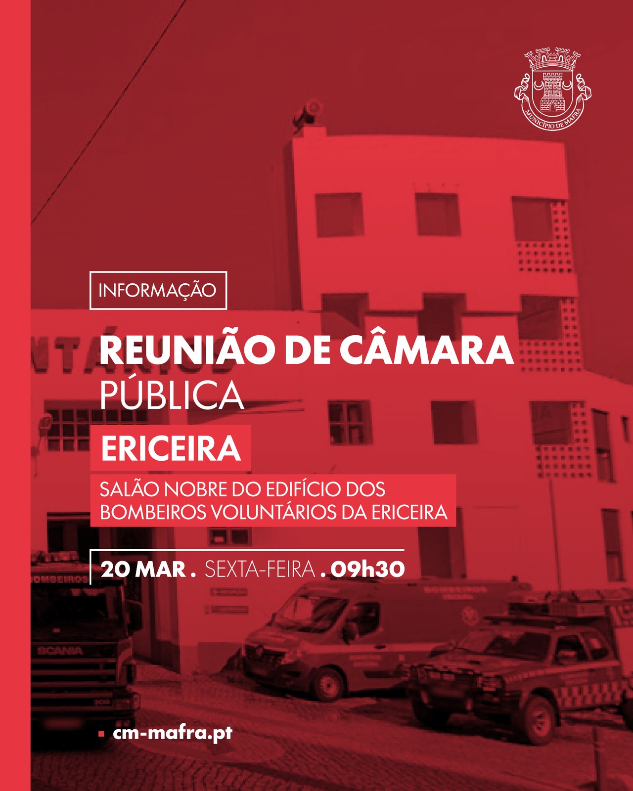 Para uma maior proximidade, transparência e participação dos cidadãos, as reuniões ordinárias públicas da Câmara Municipal de Mafra são descentralizadas. No dia 20 de março, sexta-feira, a sessão terá lugar no edifício da Associação Humanitária dos Bombeiros Voluntários da Vila da Ericeira, às 09h30.