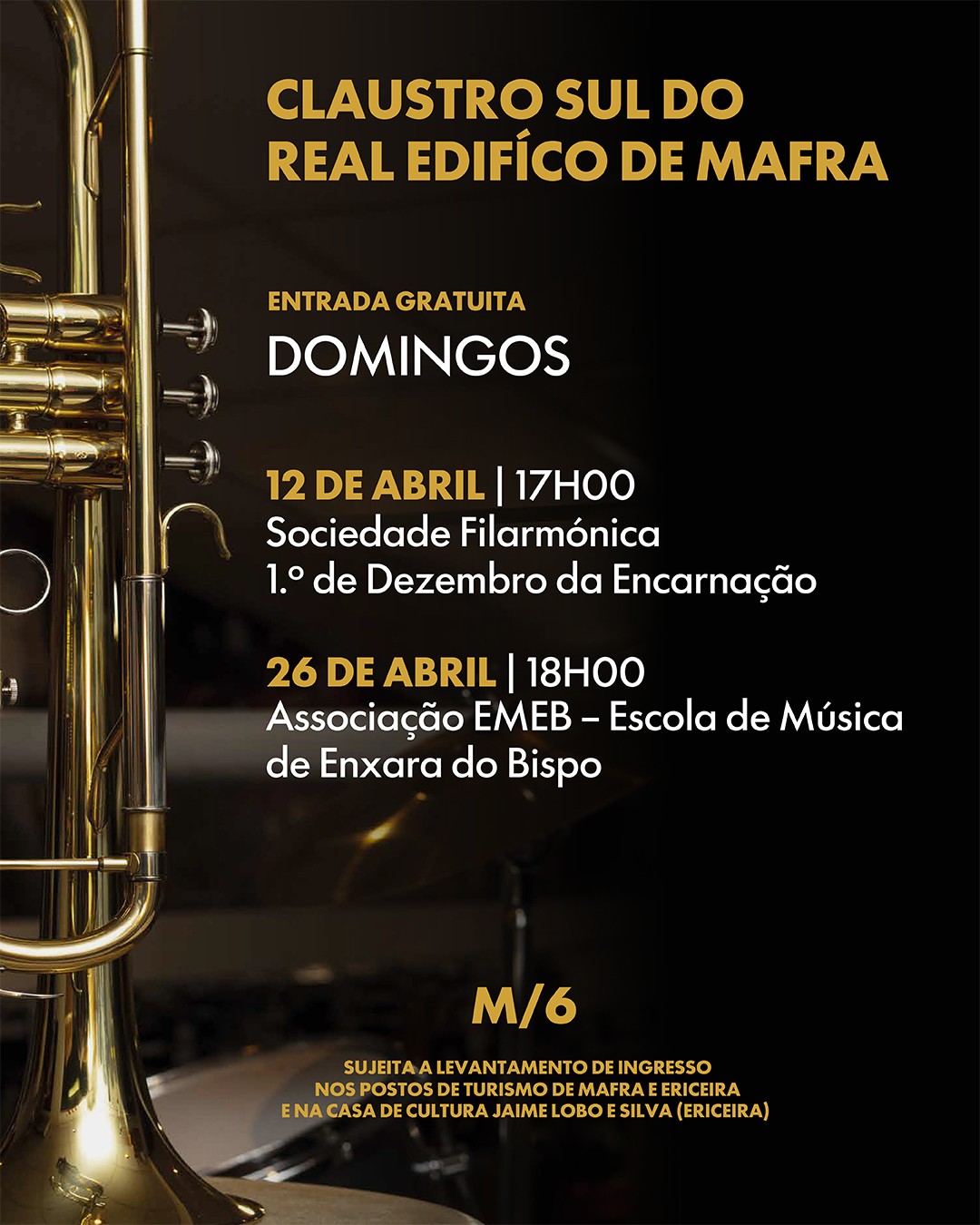 Entrada gratuita, sujeita a levantamento de ingressos nos Postos de Turismo de Mafra e Ericeira, bem como na Casa de Cultura Jaime Lobo e Silva (Ericeira).