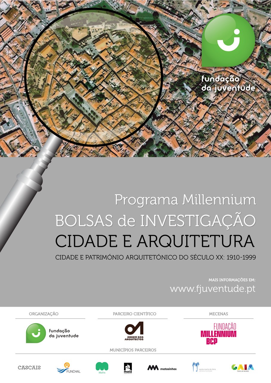 O Programa Millennium - Bolsas de Investigação “Cidade e Arquitetura” consiste no apoio ao desenvolvimento de estudos técnicos e científicos inéditos que demonstrem: a singularidade e a excelência do património construído no século XX; desenvolvimentos relevantes para o enriquecimento da carta patrimonial dos Municípios; apoio à inventariação do património arquitetónico do século XX; contributo no traçar de estratégias de salvaguarda do património; participação na criação de novas e inovadoras rotas e circuitos turísticos e culturais. Os bolseiros poderão analisar os Municípios aderentes ao programa: Cascais, Funchal, Mafra, Maia, Matosinhos, Santa Maria da Feira e Vila Nova de Gaia, tendo em conta o seu património cultural classificado ou em vias de classificação.