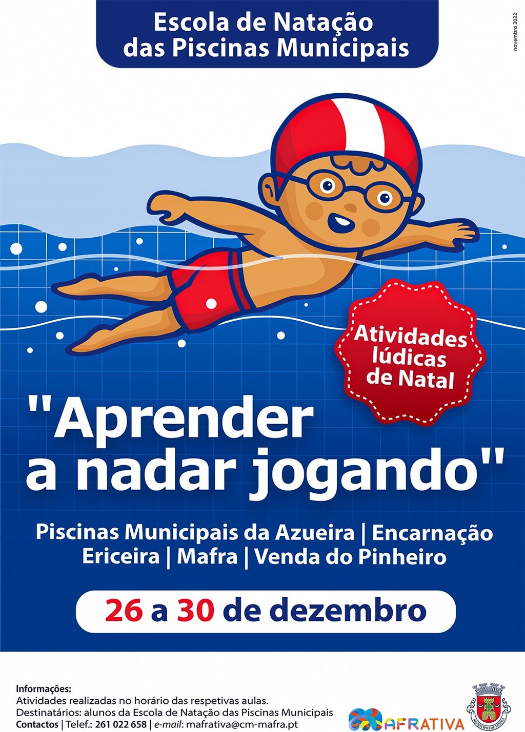 Adicionar a calendário2022-12-26 00:00:002022-12-30 00:00:00Europe/LisbonAtividades Lúdicas de Natal "Aprender a Nadar Jogando"Piscinas Municipais do Concelho de Mafra