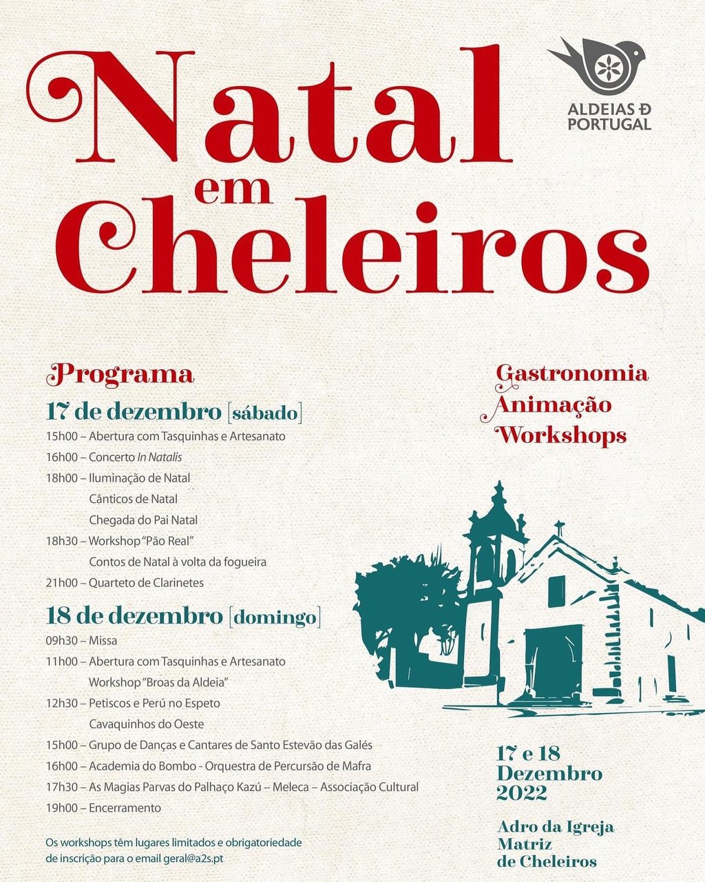 Adicionar a calendário2022-12-17 00:00:002022-12-18 00:00:00Europe/LisbonNatal em CheleirosGastronomia | Animação | WorkshopsAdro da Igreja Matriz de Cheleiros