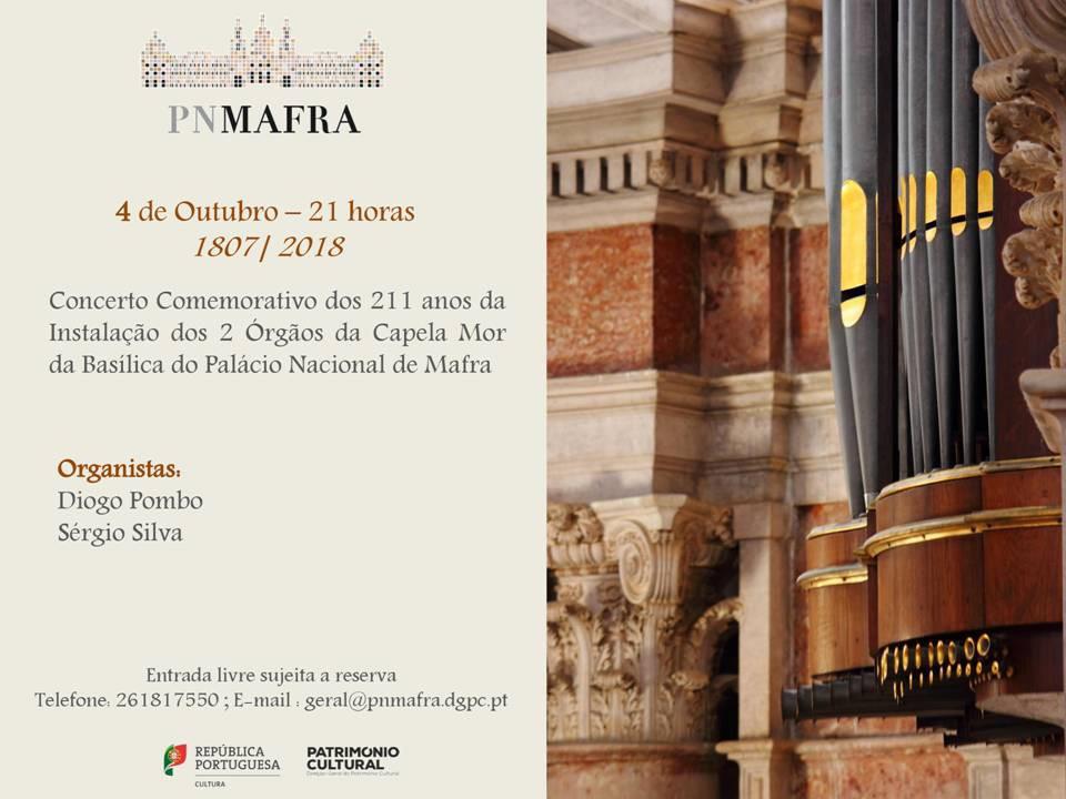 Adicionar a calendário2018-10-04 21:00:002018-10-04 21:00:00Europe/LisbonConcerto Comemorativo dos 211 anos da instalação dos 2 órgãos da Capela Mor da Basílica do Palácio Nacional de MafraNo dia 4 de outubro de 1807, Dia de S. Francisco, com a presença de D. João VI, foram inaugurados os Órgãos da Epístola e do Evangelho, concluindo-se, assim, a instalação dos 6 Órgãos da Basílica do Palácio Nacional de Mafra.Basílica do Palácio Nacional de Mafra