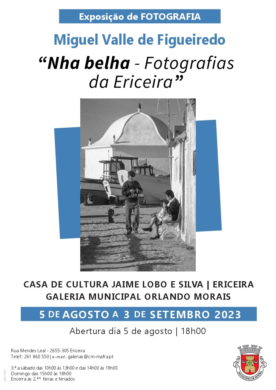 Adicionar a calendário2023-08-05 00:00:002023-09-03 00:00:00Europe/LisbonExposição "Nha belha - Fotografias da Ericeira", de Miguel Valle de FigueiredoGaleria Municipal Orlando Morais, Casa de Cultura Jaime Lobo e Silva - Ericeira