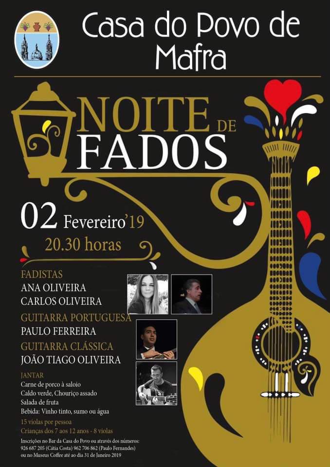 Adicionar a calendário2019-02-02 20:30:002019-02-02 20:30:00Europe/LisbonNoite de FadosFadistasAna OliveiraCarlos OliveiraGuitarra Portuguesa | Paulo FerreiraGuitarra Clássica | João Tiago OliveiraCasa do Povo de Mafra