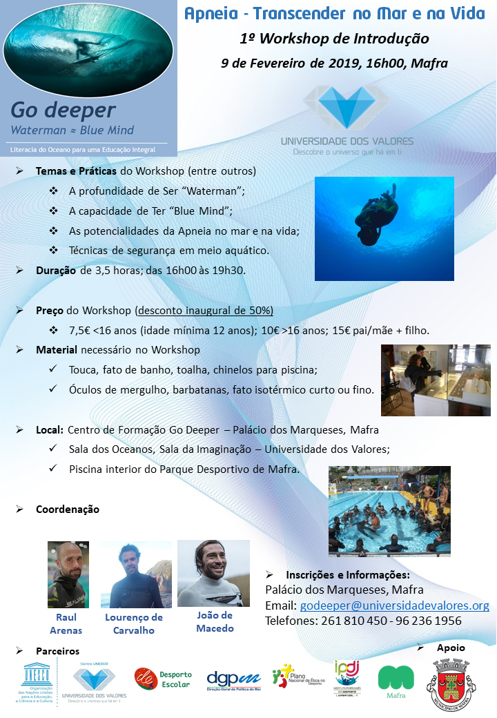 Adicionar a calendário2019-02-09 16:00:002019-02-09 19:30:00Europe/LisbonGo deeper - Apneia - Transcender no Mar e na VidaCentro de Formação, Palácio dos Marqueses | Sala dos Oceanos, Sala da Imaginação, Universidade dos Valores | Piscina Interior, Parque Desportivo Municipal de Mafra
