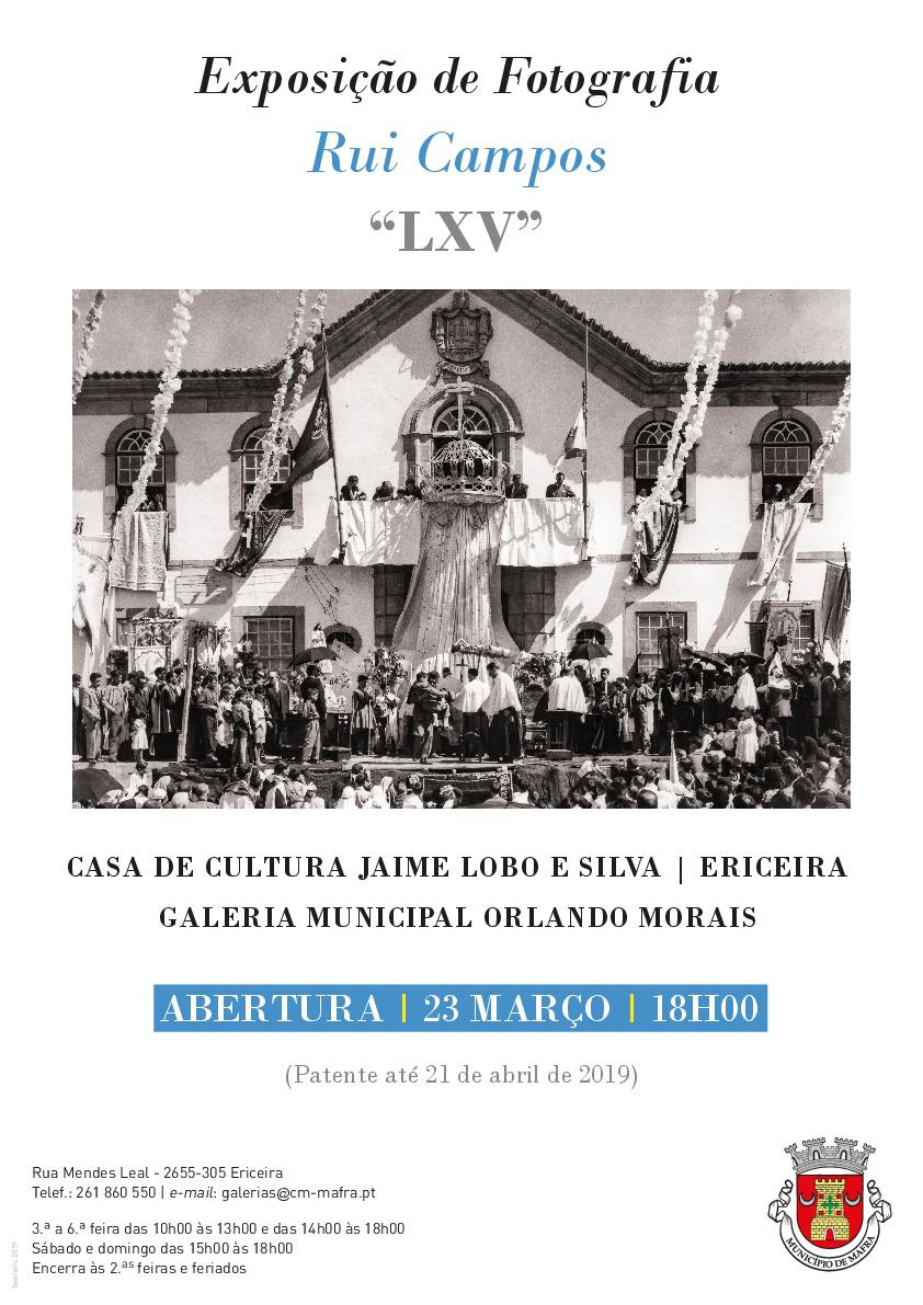 Adicionar a calendário2019-03-23 10:00:002019-04-21 18:00:00Europe/LisbonExposição de Fotografia "LXV", de Rui CamposAbertura dia 23 de março às 18h00Galeria Orlando Morais, Casa de Cultura Jaime Lobo e Silva - Ericeira