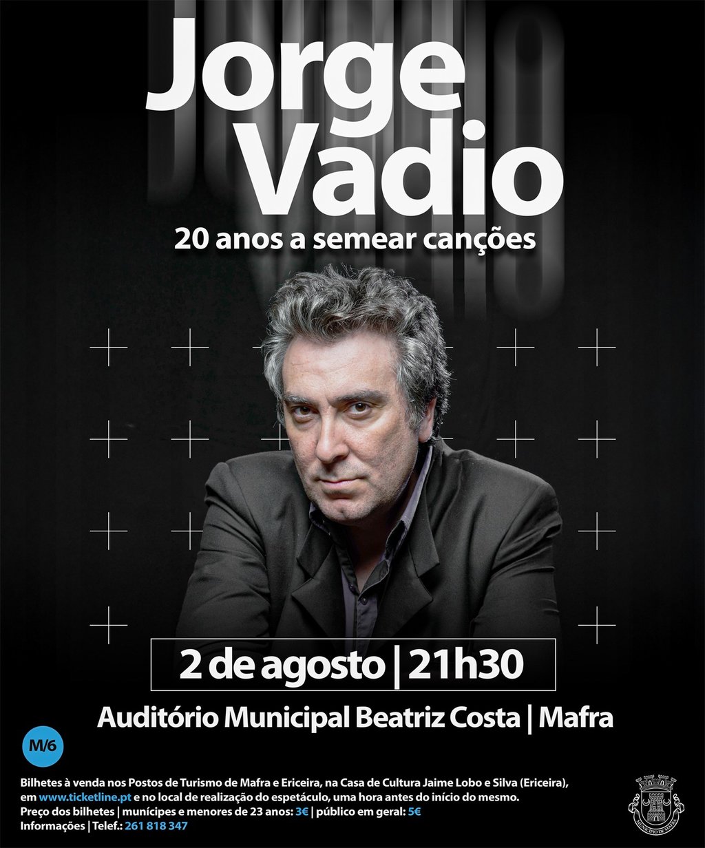 Adicionar a calendário2025-08-02 00:00:002025-08-02 00:00:00Europe/LisbonConcerto "Jorge Vadio - 20 anos a semear canções"Auditório Municipal Beatriz Costa - Mafra