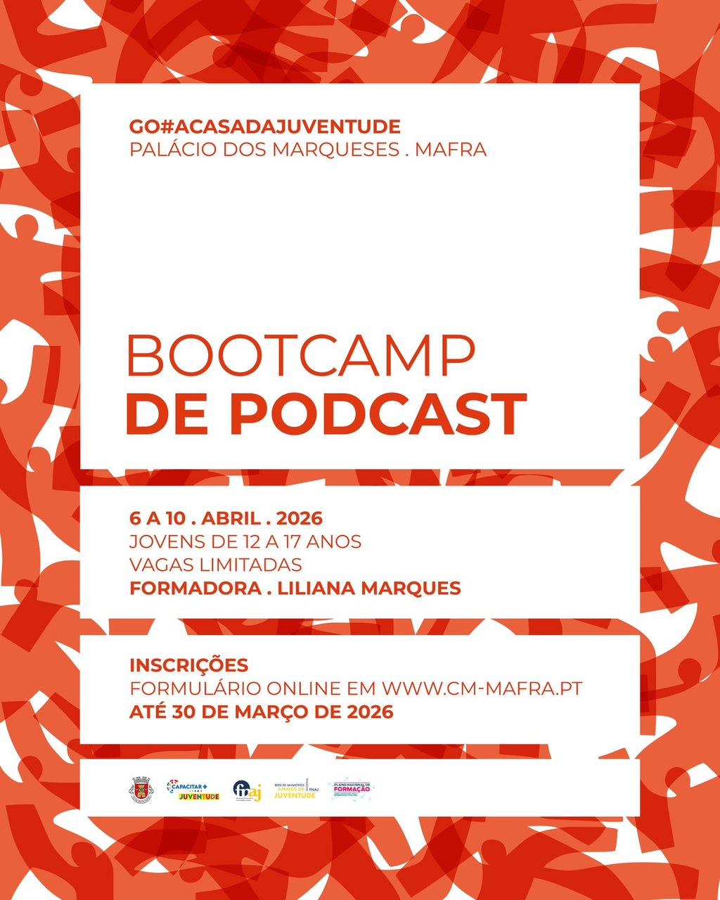 Adicionar a calendário2026-04-06 00:00:002026-04-10 00:00:00Europe/LisbonBootcamp de Podcast para JovensGO# A Casa da Juventude - Palácio dos Marqueses - Mafra