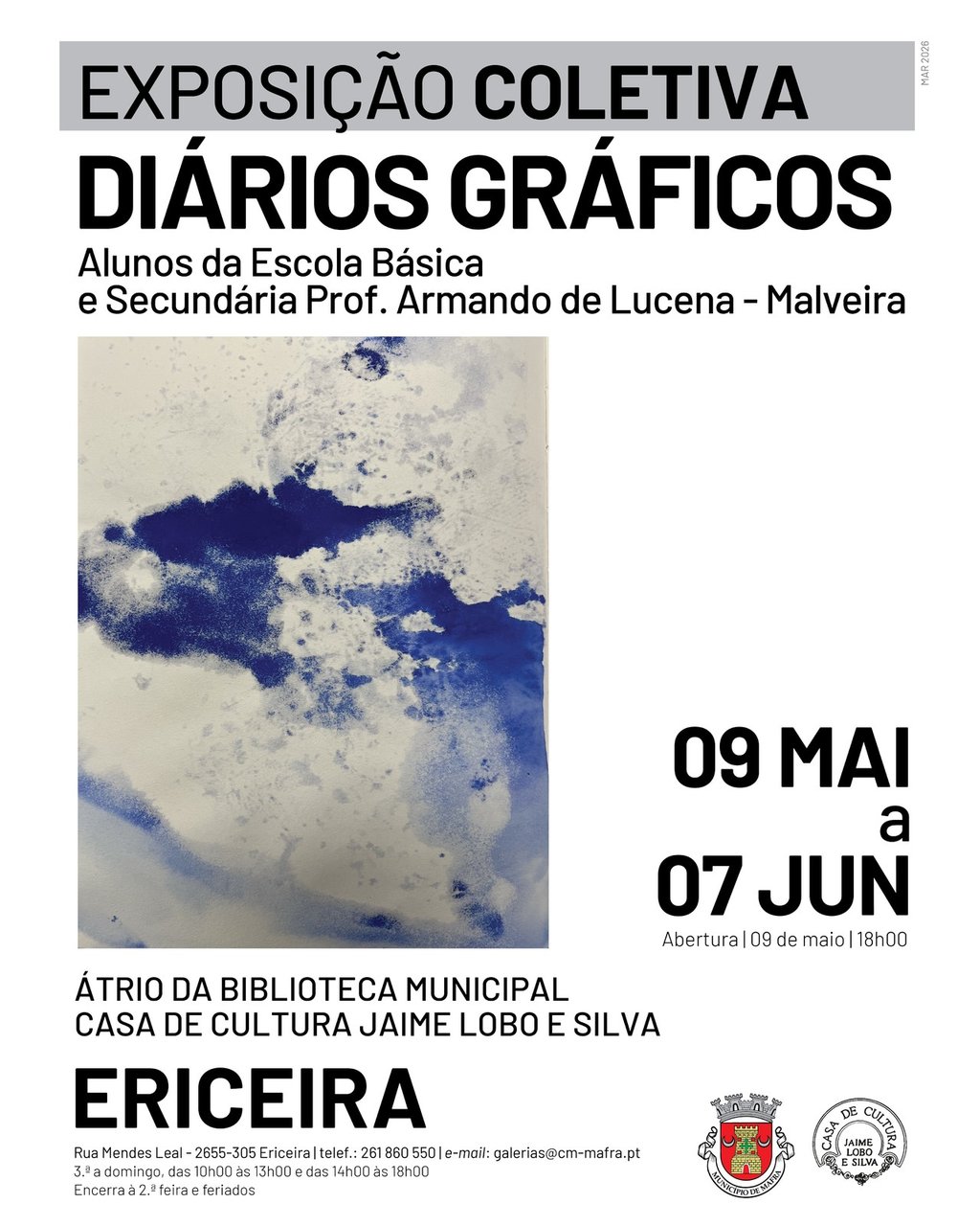 Adicionar a calendário2026-05-09 00:00:002026-06-07 00:00:00Europe/LisbonExposição coletiva"Diários Gráficos", pelos alunos da Escola Básica e Secundária Prof. Armando de Lucena - MalveiraÁtrio da Biblioteca Municipal, Casa de Cultura Jaime Lobo e Silva - Ericeira
