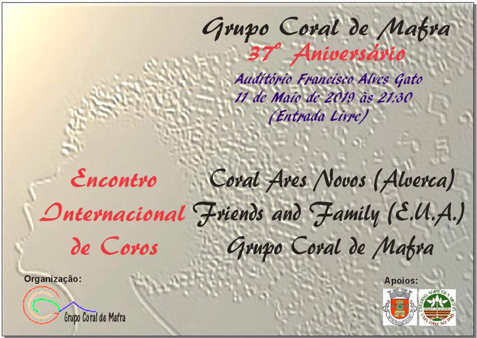 Adicionar a calendário2019-05-11 21:30:002019-05-11 21:30:00Europe/Lisbon37.º Aniversário do Grupo Coral de MafraEncontro Internacional de CorosAuditório da Casa da Música Francisco Alves Gato - Mafra