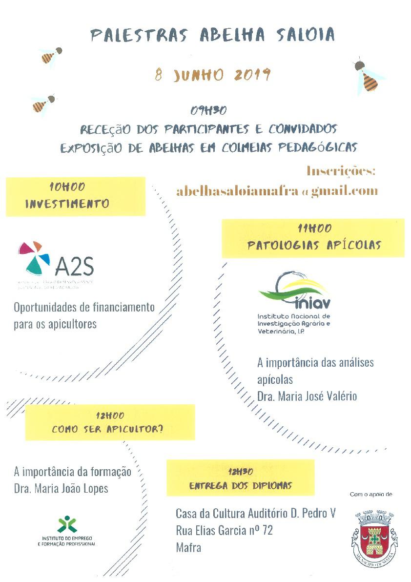 9h30 - Receção dos participantes e convidados | Exposição de abelhas em colmeias pedagógicas 10h00 - Investimento | Oportunidades de financiamento para os apicultores 11h00 - Patologias apícolas | A importância das análises apícolas - Dra. Maria José Valério 12h00 - Como ser apícultor? | A importância da formação - Dra. Maria João Lopes 12h30 - Entrega dos diplomas